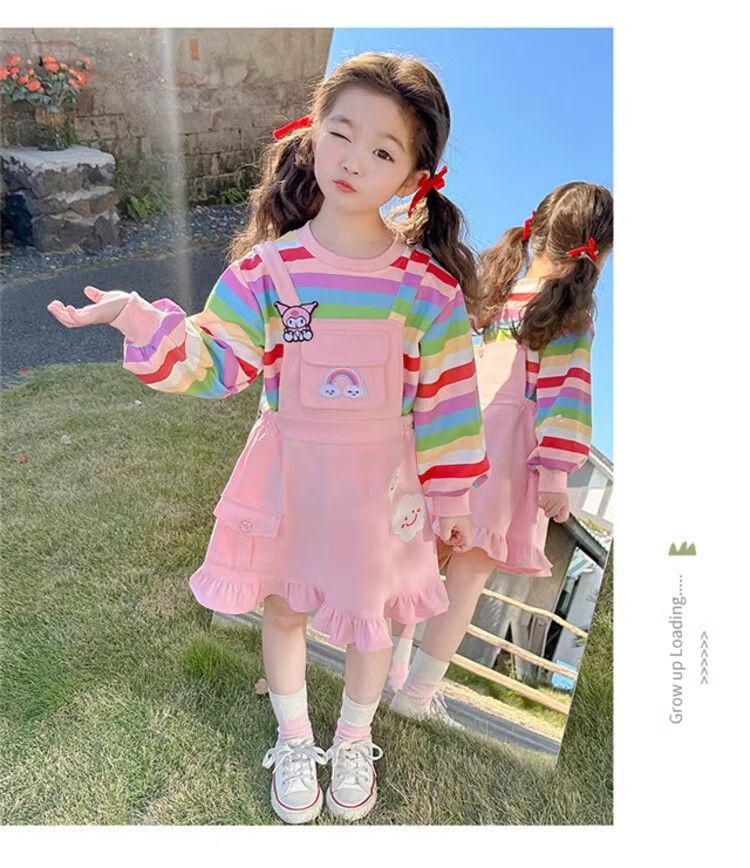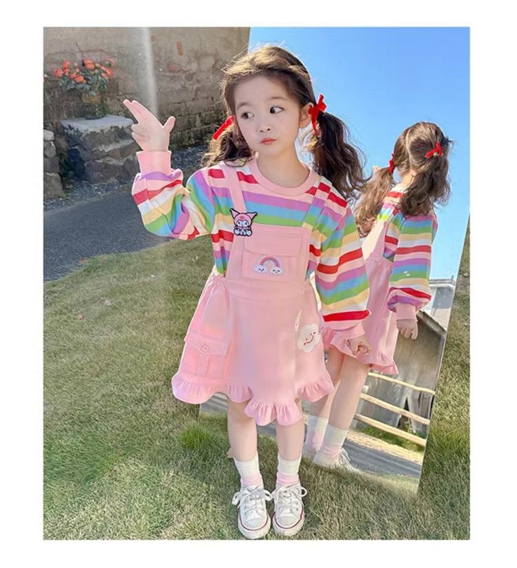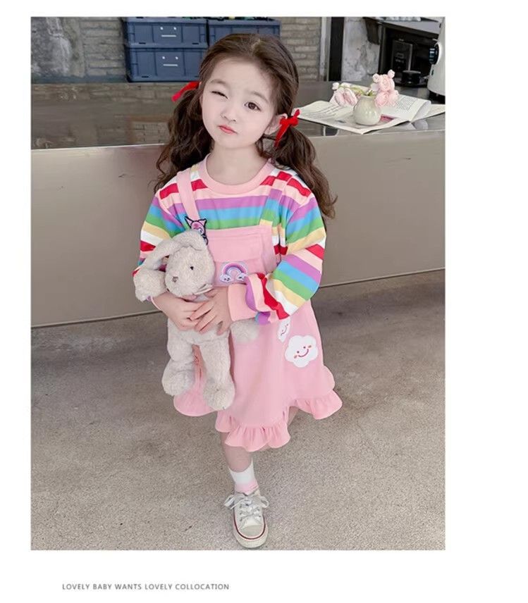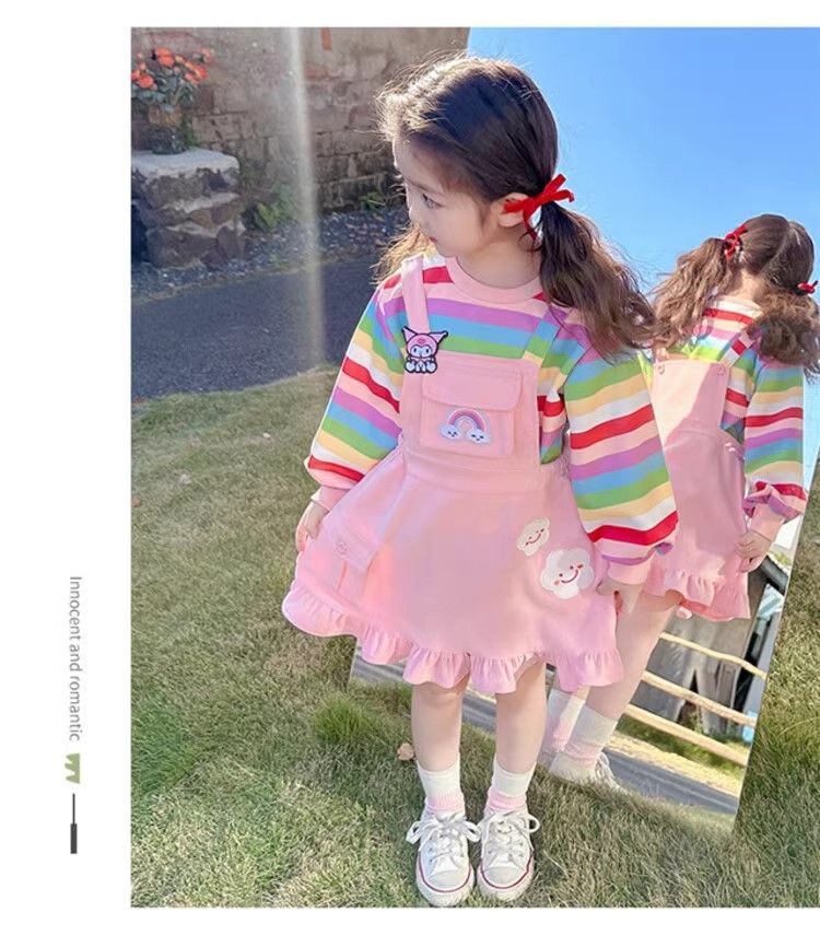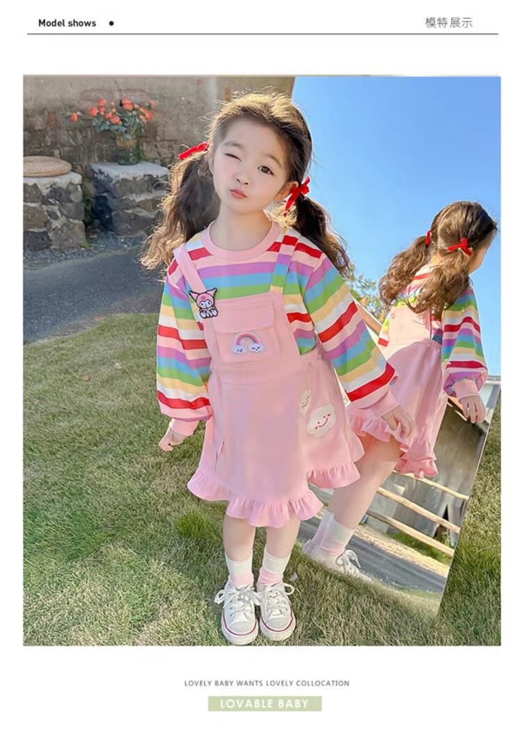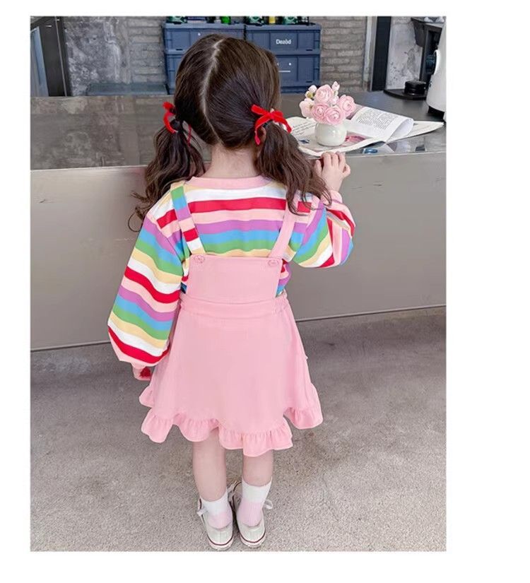 第 1 件 : 2025年新款洋氣兒童彩虹條紋上衣+背帶公主裙兩件組
