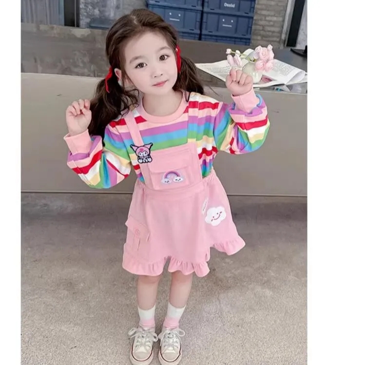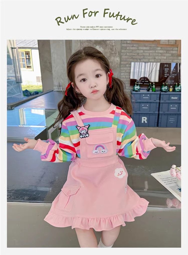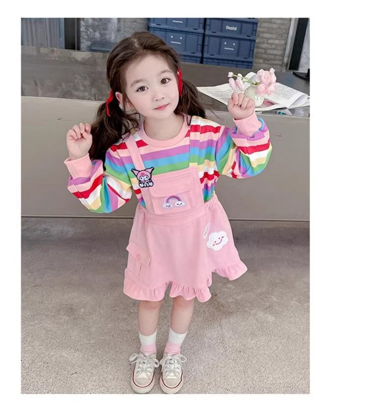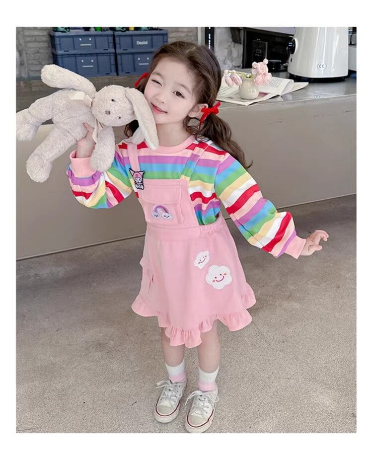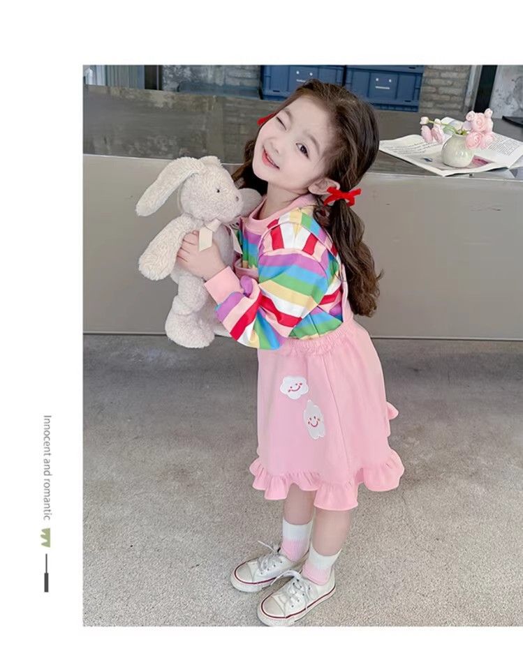 第 1 件 : 2025年新款洋氣兒童彩虹條紋上衣+背帶公主裙兩件組