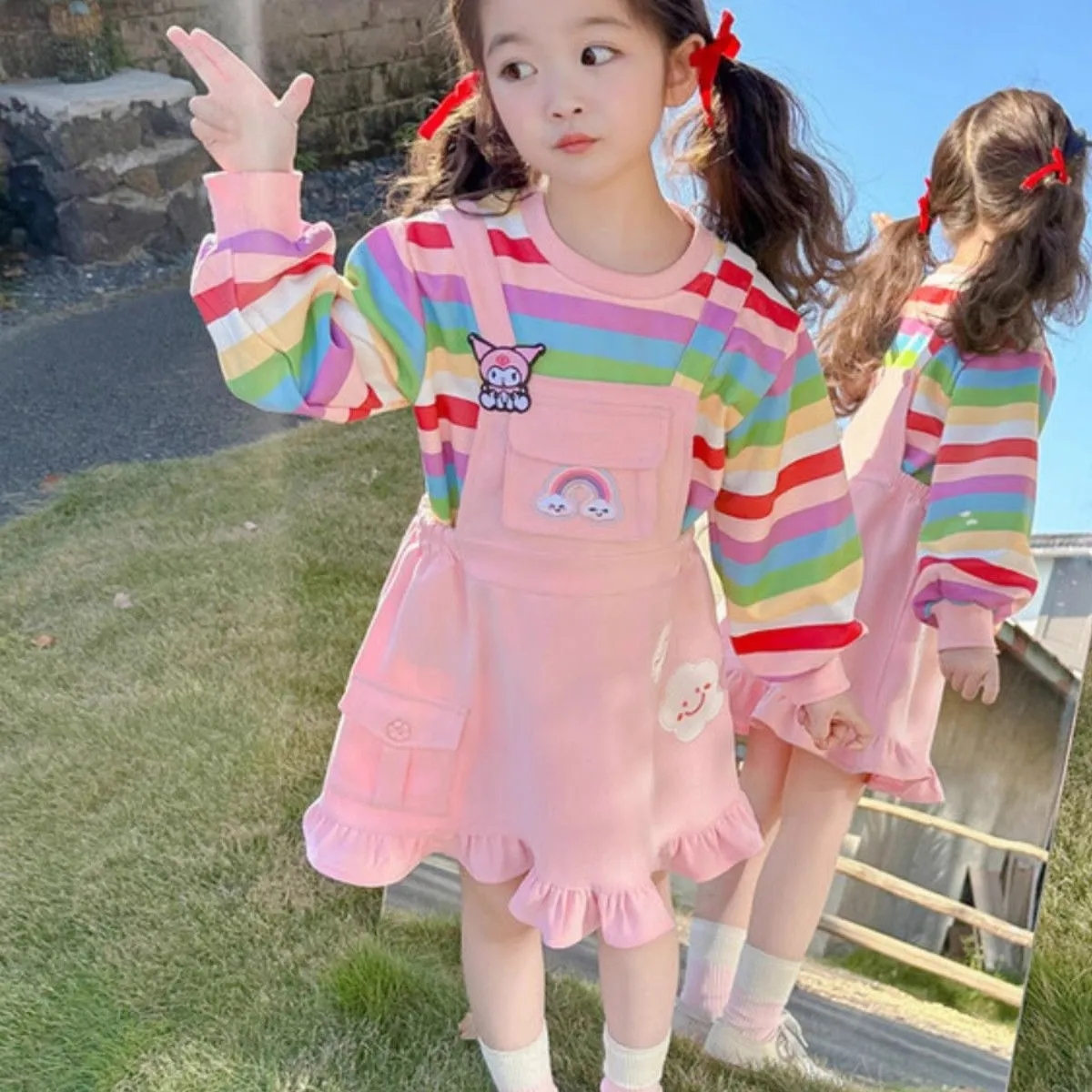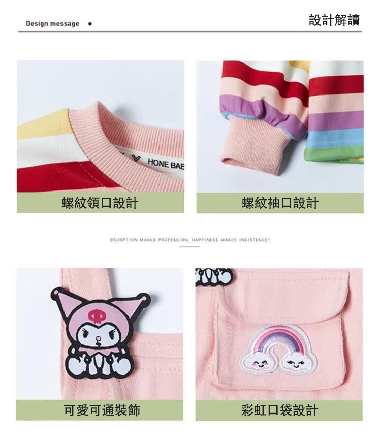 2025年新款洋氣兒童彩虹條紋上衣+背帶公主裙兩件組【贈送兒童髮飾髮繩16件】