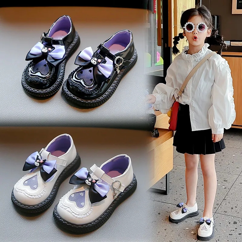 兒童新款Kuromi軟底百搭蝴蝶結卡通小皮鞋公主鞋