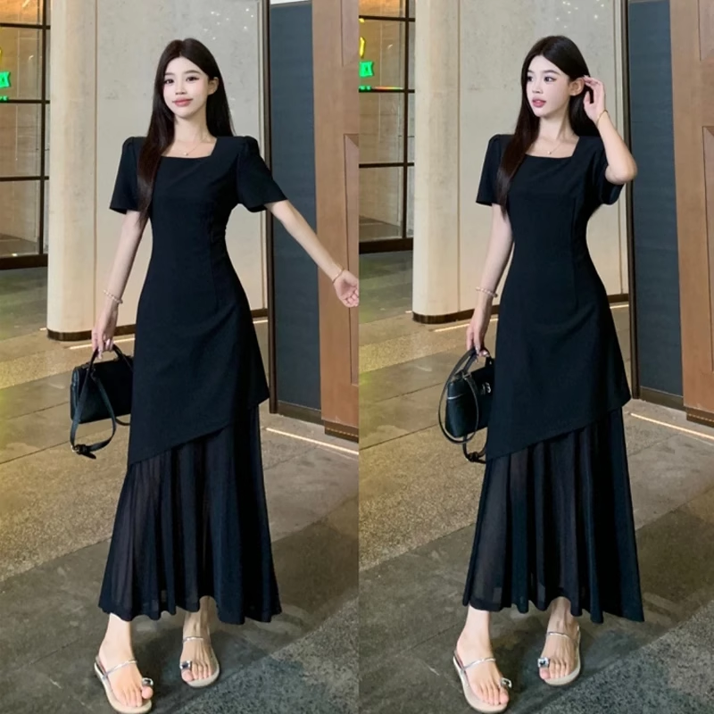 2025夏季法式赫本風優雅氣質方領收腰拼接長裙,顯瘦遮肚