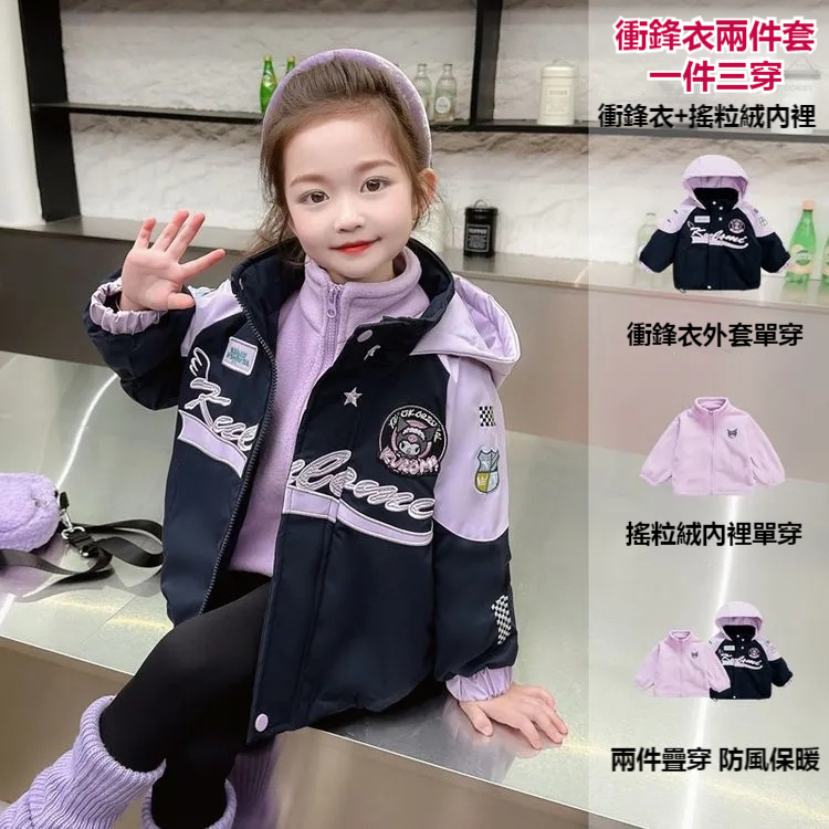 Kuromi美樂蒂女童秋冬可拆三合一夾棉衝鋒衣外套+搖粒絨外套【贈送保暖針織毛綫帽+包包】